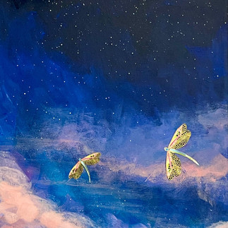 I was really happy with this piece. It came at a time in need. I originally came up with the composition of the painting when I was 16, in New York City at Parsons the New School. I was missing my dad and my Uncle Dan who both passed away. They often come to my as butterflies and dragonflies.